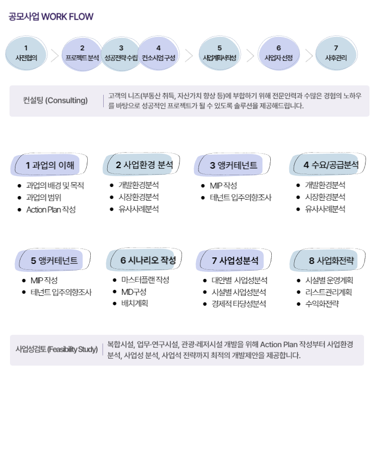 프로젝트별 제반 환경여건을 분석하고, 그에 따른 사업성 분석의 결과를 제시함으로써, 주거/ 사업/업무 복합개발 관광단지 개발 등 각종 부동산 개발 사업에 있어서 선택 가능한 최적의 개발대안을 재시해 드립니다.
